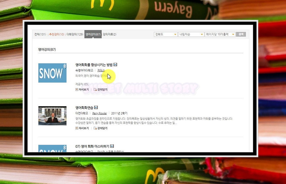 4. 영어회화를 향상시키는 방법, 연습, 마스터하기 등 여러 가지 강좌가 보이는데요. 마음에 드는 것을 하나 클릭해 보세요. 참고로 제목 옆에 아이콘이 보이는데요. 해당 아이콘이 동영상 파일을 의미한다면 동영상 강의에요. 일부 강의의 경우 문서나 이러닝 자료로 되어 있는 경우도 있으니 참고해 주세요.
