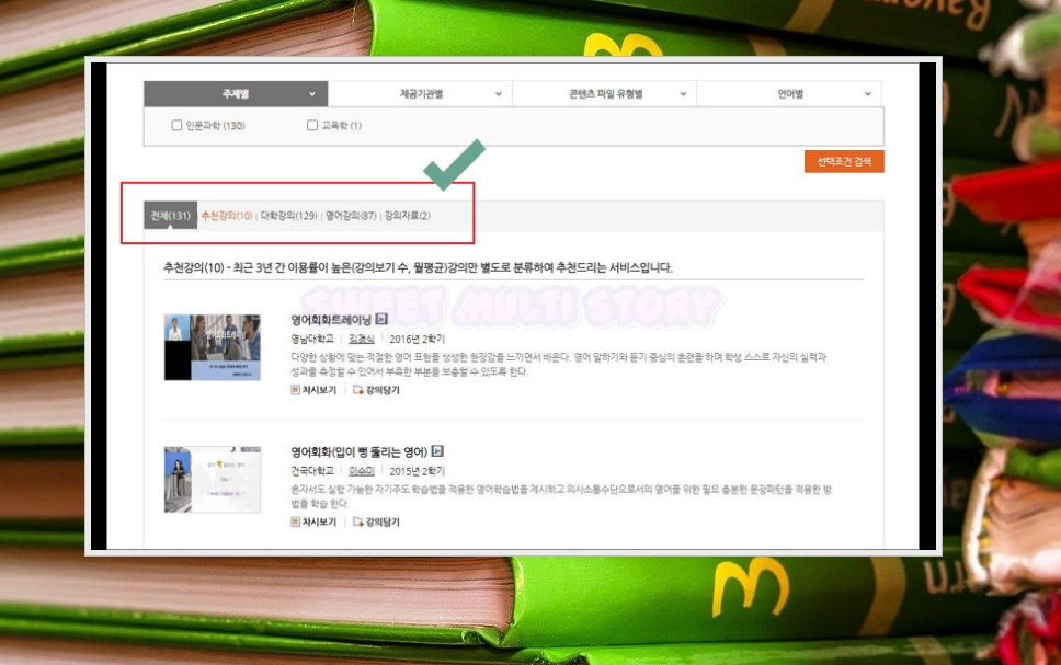 1. 언어를 익히기 위해서는 책만 가지고는 혼자 공부하기 어려워요. 말을 해야 하기 때문에 듣기 자료가 필요하기 때문이에요. 거기에 더하여 가르쳐 주는 사람이 있으면 같은 시간 대비 학습 효과가 올라가는데요. 꼭 혼자 학습을 해야 하는 경우라면 KOCW에서 제공하는 무료 강의 서비스를 이용해 보세요.