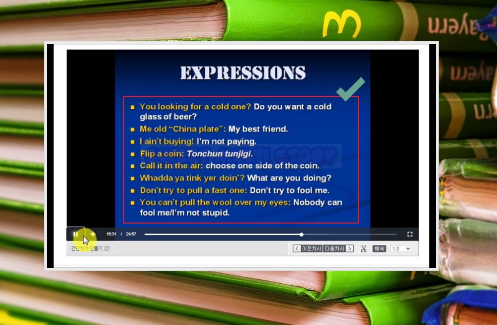 7. 동영상 강의를 선택해 보았어요. 그럼 이렇게 동영상 플레이어가 재생되는데요. 화면에 배워야 할 내용이 나타난 경우가 많기 때문에 영어회화 수업을 듣기 위해 필요한 학습 자료를 따로 구할 필요가 없어요. 서적을 구매하지 않고, 무료로 혼자 공부하기에 좋아요.
