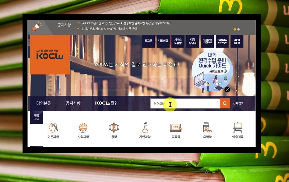 2. 모두를 위한 열린 강좌 사이트인 KOCW는 누구나 부담 없이 이용할 수 있는 곳이에요. 인문과학, 사회과학, 자연과학, 교육학, 의약학, 예술체육, 공학, 컴퓨터 등 다양한 분야를 배울 수 있는 곳인데요. 무료 영어회화 공부 혼자하기에도 꽤 유용해요.