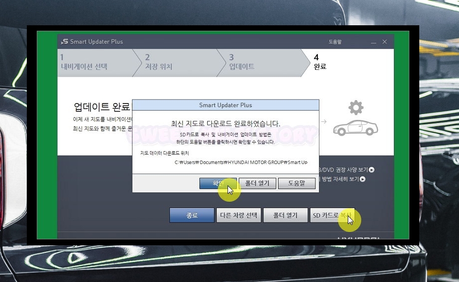 12. 다운로드가 완료되면 확인 버튼을 누른 후 SD 카드로 복사하면 돼요. 복사가 완료되면 현대 차량에 설치된 내비게이션 기기에 SD카드를 꼽아주세요. 기기에서 설정 메뉴로 들어가면 업그레이드 진행 버튼이 있는데요. 해당 버튼을 누르면 기기를 업데이트 할 수 있어요.