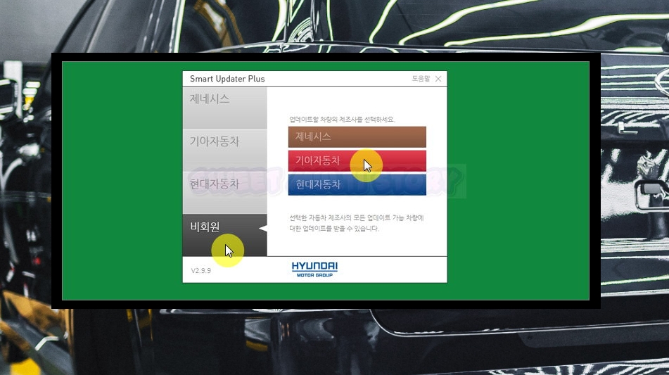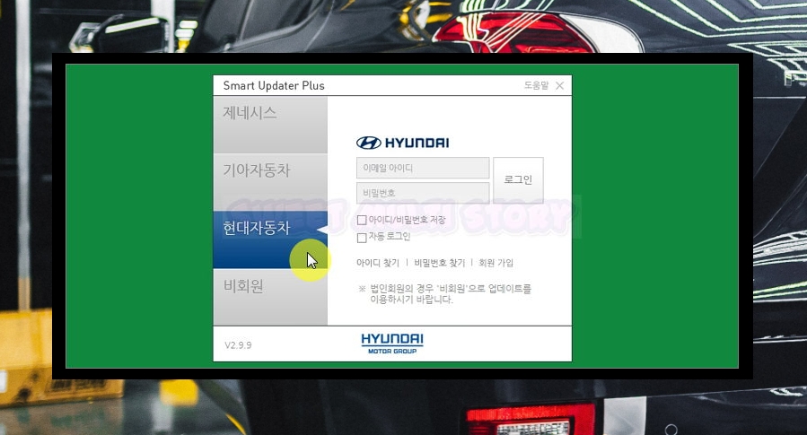 6. 설치가 완료되면 Smart Updater Plus 프로그램을 실행해 보세요. 해당 소프트웨어를 이용하면 현대자동차는 물론이고, 기아자동차와 제네시스에 달린 내비도 업그레이드할 수 있어요. 로그인 화면이 나타나는데요. 회원 가입을 하기 싫으신 분들은 비회원 버튼을 눌러보세요.