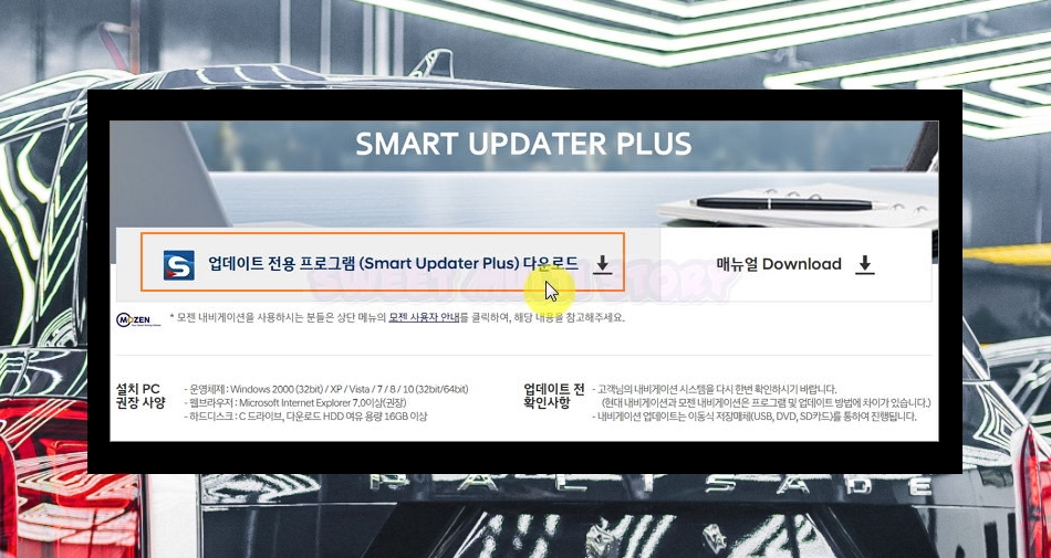 4. 업그레이드 전용 프로그램 다운로드를 버튼을 눌러 설치 파일을 다운 받아 주세요. 메뉴얼도 있으니 현대자동차 내비게이션을 업그레이드 하다가 막히는 부분이 있으면 참고해 주세요.