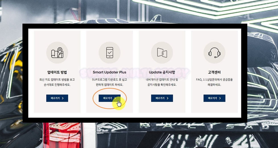 3. 새롭게 열린 웹페이지를 보면 내비게이션에 관련된 여러 서비스 버튼이 마련되어 있어요. 현대자동차 내비게이션 업그래이드 프로그램을 다운 받으려면 Smart Updater Plus 바로가기를 클릭하면 돼요.
