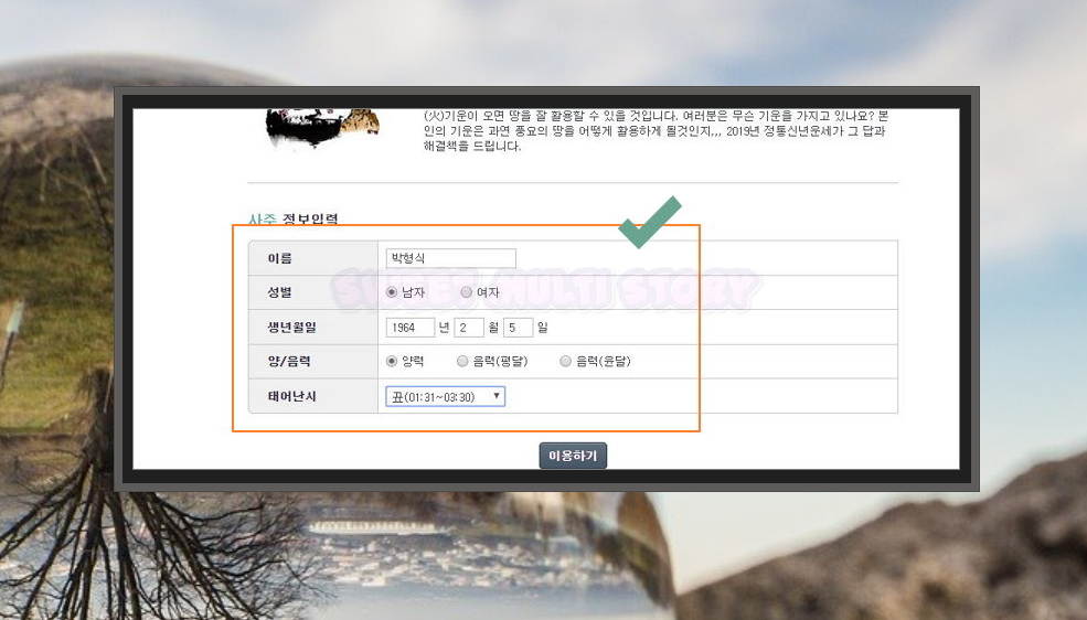 3. 이용법은 간단해요. 자신의 사주 정보를 입력하기만 하면 되는데요. 이름, 생년월일, 성별, 양력 및 음력 여부, 태어난 시를 정확하게 입력해 주세요. 다 입력하셨으면 "이용하기" 버튼을 눌러 줍니다.