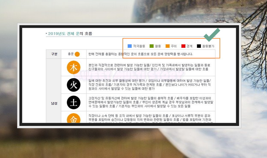 4. 농협 사이트에서 볼 수 있는 무료 풀이 결과가 나타났네요. 단순히 글로만 나오는 것이 아니라, 이렇게 이해를 돋기 위한 아이콘 이미지가 사용되고 있는 점이 인상 깊습니다. 2019년도 전체 운의 흐름을 통해 자신의 오행이 어떠한 영향을 미치는지 알아보실 수 있어요.
