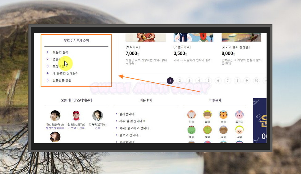 10. 무료 인기운세를 통해 사주팔자를 보실 수 있는데요. 홈페이지 맨 아랫쪽에서 순위를 살펴볼 수 있어요. 명품사주를 클릭하여 이용해 보도록 하겠습니다.