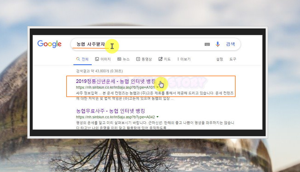 1. 첫 번째로 이용해 볼 곳은 농협이에요. 농협에서는 인터넷 뱅킹을 이용하는 분들을 위해 자신의 팔자에 대한 내용을 볼 수 있는 서비스를 무료로 제공하고 있는데요. 퀄리티가 매우 높아서 인터넷으로 운세를 보는 사람들에게 인기가 높답니다. 제가 검색한 것과 같이 "농협 사주팔자"를 검색하면 바로 나와요.