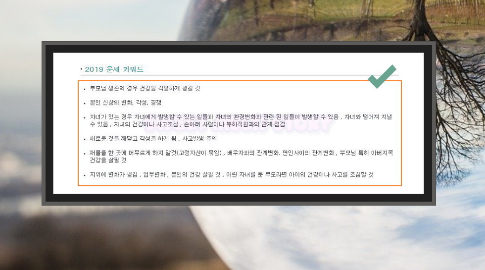 5. 보통 사주를 보면 긴 문장으로 된 해석을 많이 보게 되는데요. 여기서도 그러한 풀이를 볼 수 있습니다. 풍부한 풀이와 더불어 이렇게 운세 키워드도 함께 제공하는데요. 요점만 간단히 보고 싶은 분들에게 유용해요. 부모님의 건강, 본인의 신상 변화, 주위 사람들에게 일어날 일, 경제력과 직업에 관한 일 등 간략하게 알려줘요.