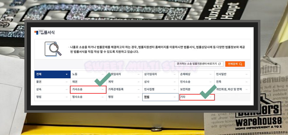 3. 여기서 받을 수 있는 양식의 종류는 많아요. 노동, 주택임대차, 상가입대차, 손해배상, 계약, 채권, 물권, 상속 등 여러 부분에 대한 양식을 찾아볼 수 있어요. 협의이혼을 할 때 제출해야 하는 신청서는 가사소송이나 기타 부분에서 찾으실 수 있을 거에요.