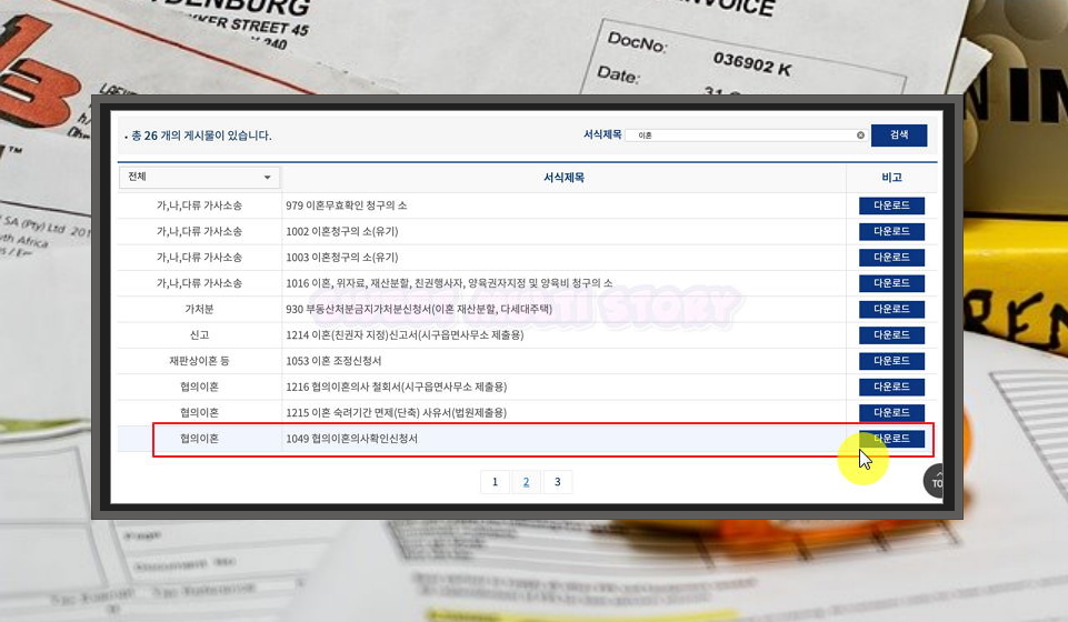 5. 검색 결과에서 두 번째 페이지로 이동해 보세요. 그럼 협의이혼 의사확인 신청서를 찾으실 수 있어요. 우리가 찾는 서식이 맞아요.