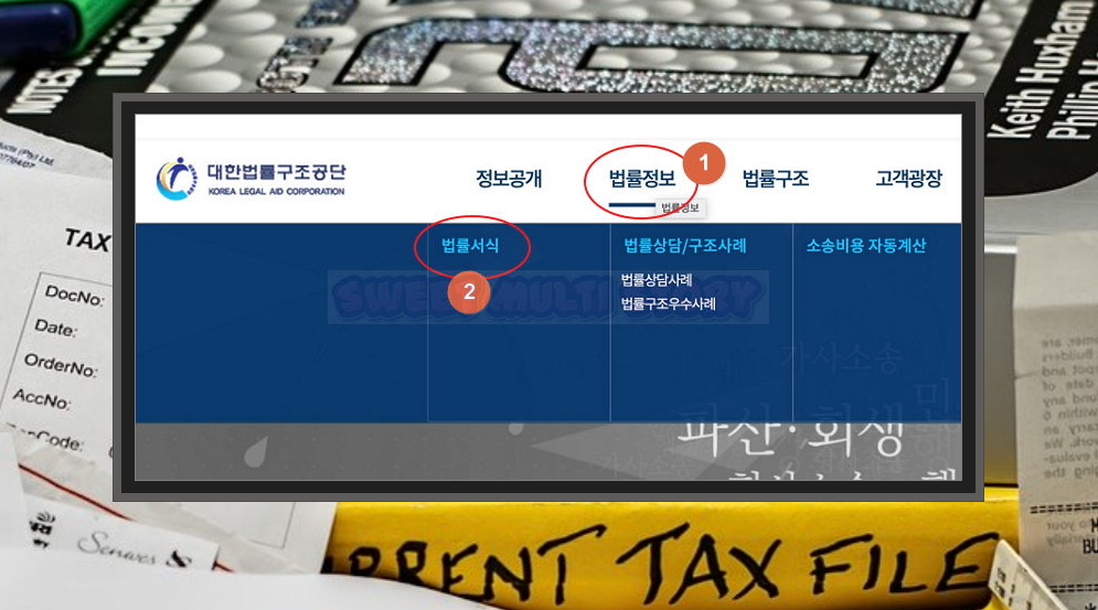 2. 대한법률구조공단 사이트에 접속했어요. 메뉴에 나와 있듯이 정보공개, 법률정보, 법률구조 서비스를 제공하고 있어요. 메뉴에 있는 법률정보를 클릭해 보세요. 그럼 협의이혼신청서 양식을 다운 받을 수 있는 법률서식 서비스가 있어요.