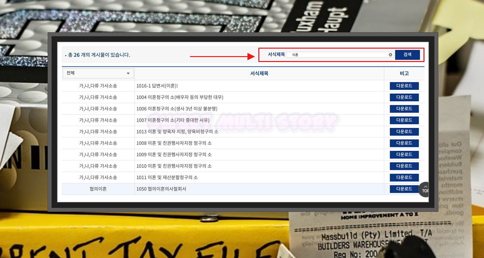 4. 카테고리 선택을 하는 것보다는 그냥 검색을 하는 것이 빨라요. 서식제목에 이혼을 입력하고 검색 버튼을 눌러보세요. 이혼 청구의 소, 양육비 청구의 소, 협의이혼 의사철회서 등이 보이네요. 옆에 있는 다운로드 버튼을 누르면 양식 파일을 내려 받으실 수 있어요.