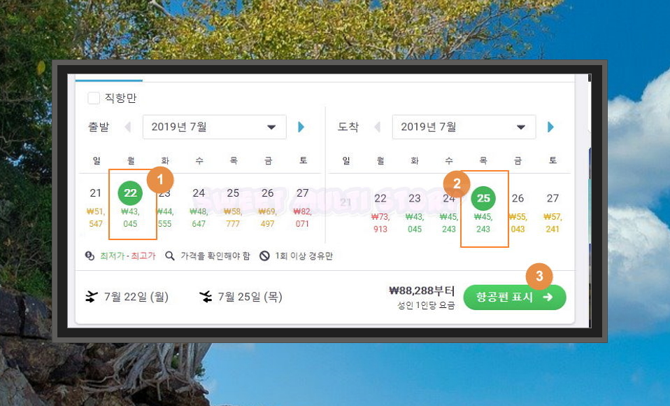 3. 앞서 언급한 것과 같이 각 날짜의 최저가 항공권의 가격이 나타나는데요. 여기서 선택하면 돼요. 녹색으로 된 금액일수록 저렴하게 예매가 가능합니다. 저는 7월 22일에 출발해서 25일에 도착하는 제주 비행기표를 선택했는데요. 왕복으로 8만원 대 후반이네요.