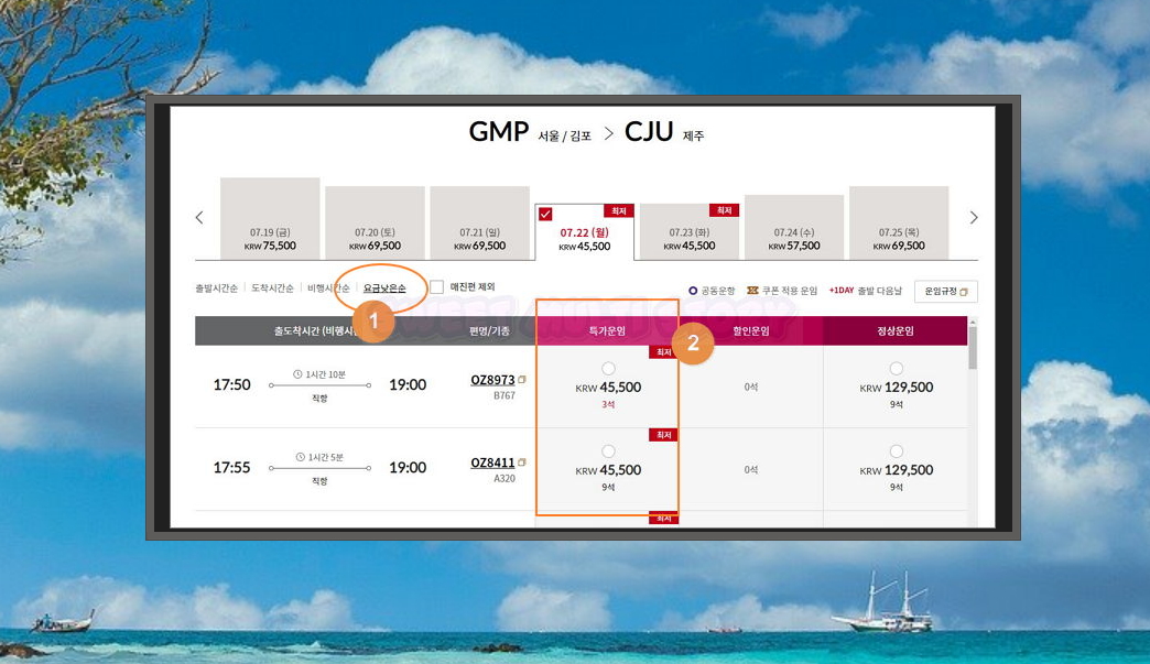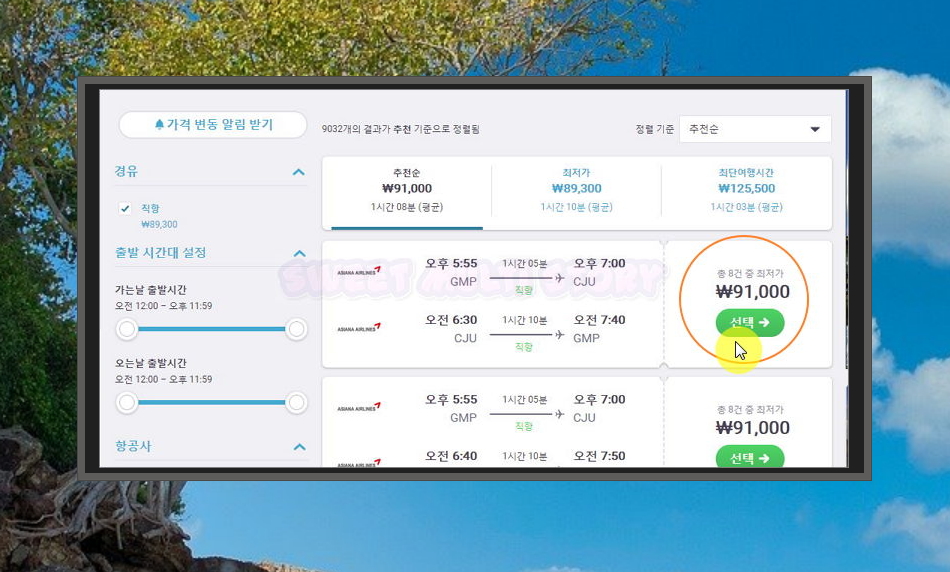 4. 이번에는 출발 시간대와 항공사를 선택할 차례인데요. 최저가 순으로 정렬하면 가장 저렴한 제주 비행기표 예약을 할 수 있어요. 물론 시간대가 마음에 들지 않을 수 있는데요. 그런 경우에는 좌측에 있는 출발 시간대 설정을 통해 시간을 조절해 보세요. 마음에 드는 시간대로 지정한 상태에서 최저가 정렬을 하면 됩니다.