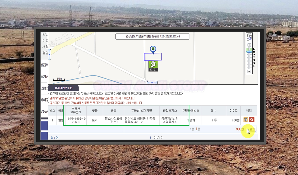 9. 무료로 살펴본 정보로는 충분하지 않다면 결제를 하시면 돼요. 토지 등기부등본 1통에 대하여 수수료로 700원이 발생해요.