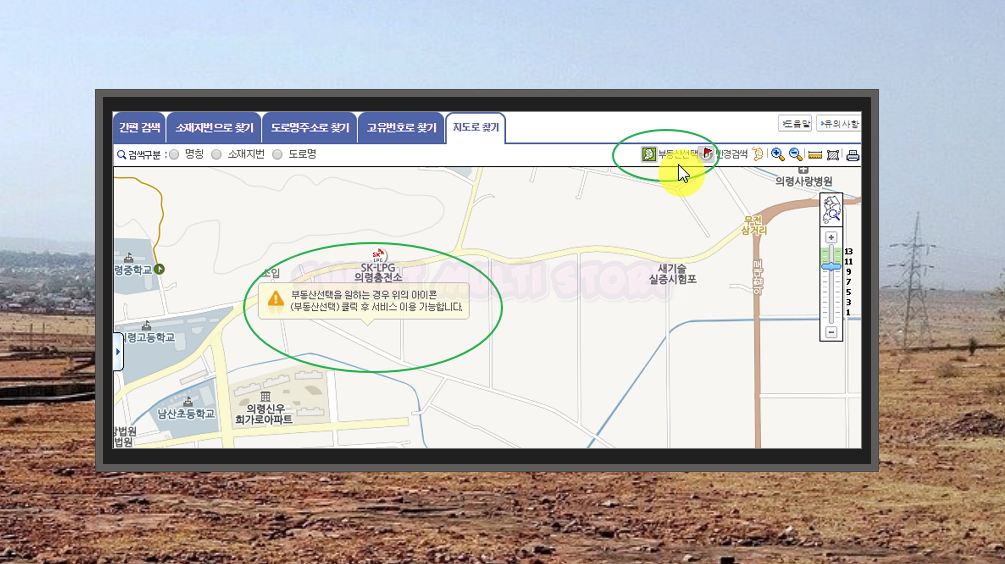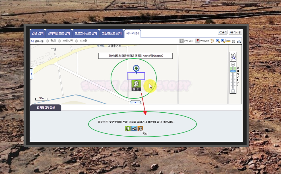 6. 토지 정보에 대한 확인이 필요한 지역을 클릭하면 해당 지역의 상세 주소가 나타나요. 마우스로 토지 아이콘을 더블 클릭하거나 하단 영역으로 드레그하여 아이콘을 옮겨 주세요.