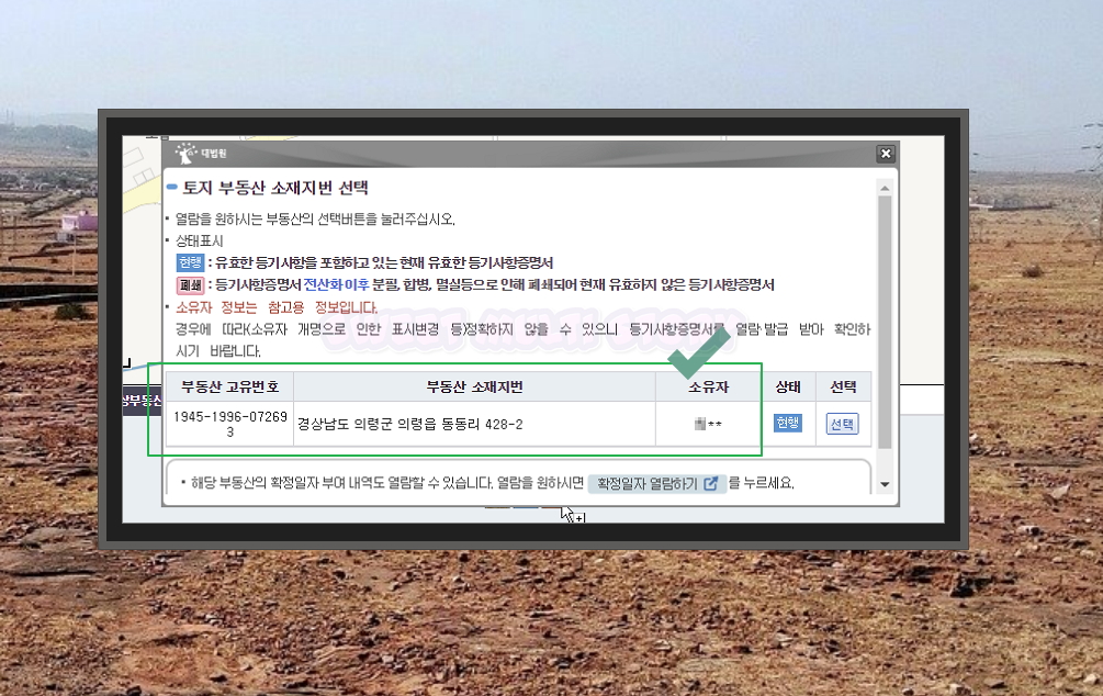 8. 다음 단계로 넘어가면 우리가 토지 등기부등본에서 무료열람을 할 수 있는 부분이 나와요. 부동산 고유번호, 소재지번, 소유자의 성씨 인데요. 이렇게 3가지 정보에 대하여 무료로 확인이 가능해요.