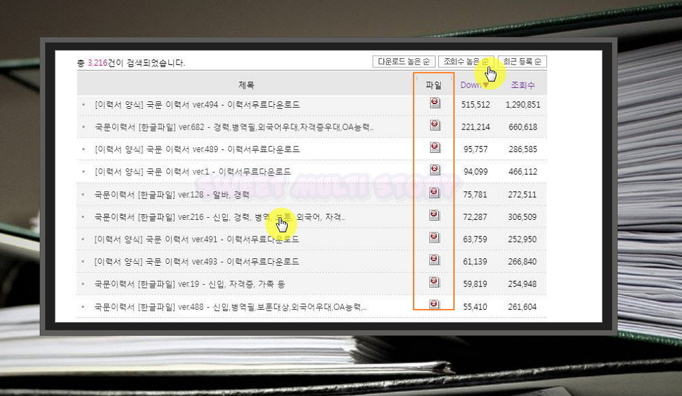 4. 검색 결과는 표 형식으로 되어 있는데요. 파일에 보시면 아래아 한글 표시가 되어 있어요. hwp는 아래아 한글 문서 포맷이에요. 해당 그림이 있는 게시물을 클릭하면 기본이력서 양식 hwp 파일을 만나보실 수 있어요. 생각보다 꽤 많은 양의 자료가 있는데요. 어떤 것을 선택해야 할지 모르겠다면 조회수나 다운로드가 높은 것을 이용하시면 돼요.