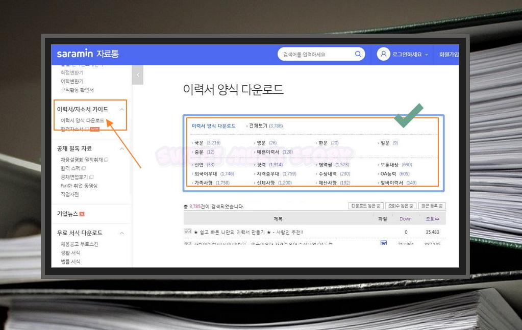 3. 자료통 페이지에 접속하게 되면 왼쪽에 있는 이력서 및 자소서 가이드 카테고리에 있는 이력서 양식 다운로드를 클릭해 주세요. 그럼 3천건 이상의 기본이력서 양식을 만나볼 수 있는데요. 일단 카테고리를 선택해 주세요.