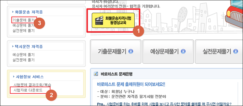 제가 무료 기출문제와 함께 화물운송 시험자료도 얻을 수 있다고 했는데요. 새롭게 열린 페이지를 통해 시험자료 다운로드 페이지로 이동할 수 있어요. 여기에 더하여 화물운송 자격시험 동영상 교육자료도 있으니 한 번 시청해보는 것도 좋을 것 같아요. 여기서 이용할 수 있는 화물운송 시험자료, 동영상 교육 자료, 기출문제 자료 모두 무료이기 때문에 부담이 없어요.