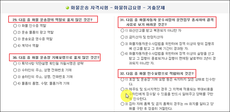 한 화면에 문제가 4개씩 나오는데요. 화물운송 자격시험 무료 기출문제를 꼼꼼히 읽어보고, 답이라고 생각하는 선택지의 번호를 마우스로 클릭해 주세요.