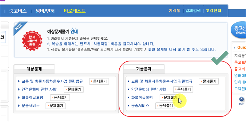 드라이버스 사이트 메뉴를 보면 운전 관련 서비스가 많아요. 지입차, 운전기사, 중고트럭, 중고버스 등 나중에 필요할 때 이용하면 좋을 거에요. 메뉴에서 가장 오른쪽을 보면 "바로테스트"가 있는데요. 해당 메뉴를 클릭하면 화물운송 종사 자격시험 기출문제를 얻을 수 있는 하위 메뉴가 나타나요. 클릭해 주세요.