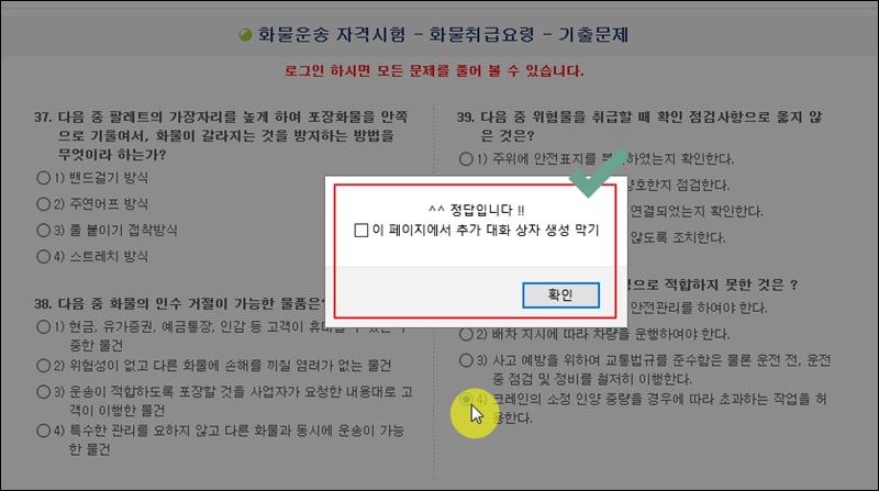 화물 인수요령으로 적합한 것을 찾는 문제를 풀어보았어요. 선택 항목 중에서 4번을 클릭한 결과 정답이라는 메시지 박스가 나타났어요. 이런 식으로 기출문제에 대한 정답 확인이 가능하오니 참고해 주세요.