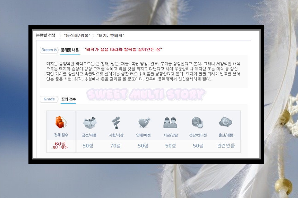 일반적으로 돼지가 나오면 좋은 것이라고 알고 있습니다. 정말 그러한지 풀이 내용을 볼까요? 예시로 "돼지가 따라와서 발목을 끌어안는 꿈"에 대해 알아보았는데요. 꿈의 점수를 보아하니 60점으로 적지만, 어느 정도의 운을 제공한다고 할 수 있는데요. 시험/직장은 70점으로 좋은 성적이나 승진을 기대해봐도 좋겠습니다.