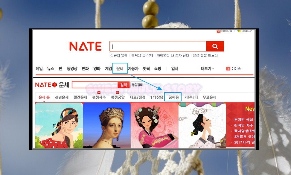 메뉴에서 '운세'를 누르면 무료 사주풀이사이트가 열리는데요. 이곳에서 "꿈해몽"을 클릭하시면 바로 이용할 수 있습니다. 보통 일반적인 해몽 사이트는 회원가입을 하거나 유료서비스로 제공하고 있는데요. 네이트에서는 그러한 번거로움 없이 공짜로 풀이를 할 수 있어서 좋습니다.