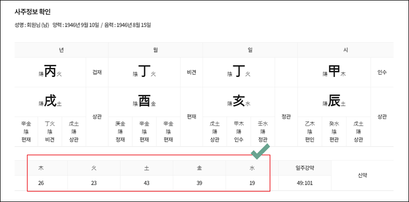 상세한 해석을 무료로 만나보기에 앞서 사주정보를 확인할 수 있게 되어 있는데요. 전문가가 아니면 이러한 것이 어떤 의미를 담고 있는지 알 수 없어요. 우리가 알아볼 수 있는 부분은 오행 정도인데요. 목, 화, 토, 금, 수 중에서 자신의 오행이 어떻게 분포되어 있는지 확인해 보세요.