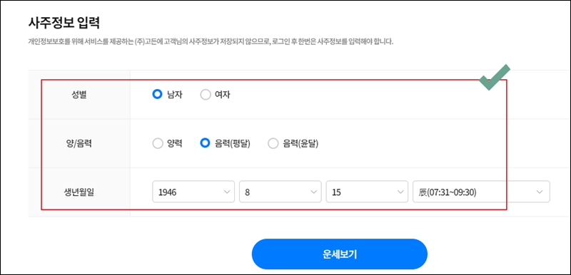 신토정비결을 통해 사주팔자 보는법은 간단해요. 가장 먼저 나의 사주정보를 입력해야 하는데요. 성별, 생년월일, 양력 또는 음력, 태어난 시각을 정확하게 입력해 주세요. 모두 정확히 입력한 상태에서 "운세보기" 버튼을 클릭해 주세요.