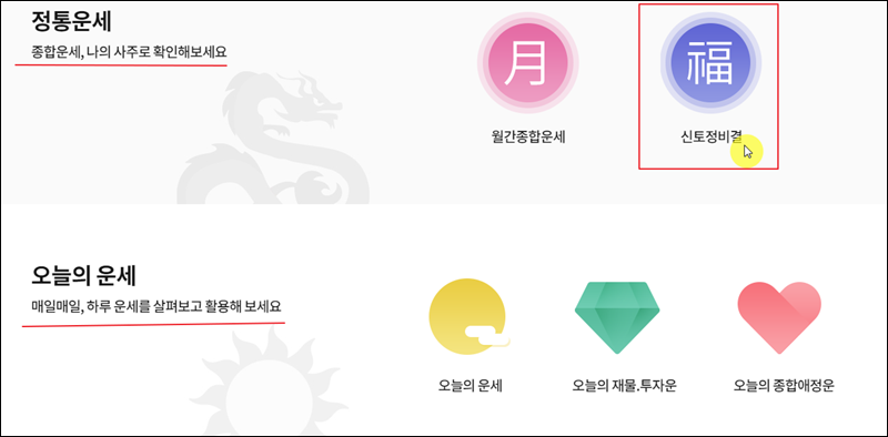 가장 먼저 만나볼 수 있는 사주팔자 서비스는 정통운세에 속하는 월간종합운세와 신토정비결이에요. 토정비결은 사주팔자를 간단히 볼 수 있는 대표적인 역술인데요. 보는법이 쉽고, 풀이가 상세하기 때문에 많은 사람들이 애용하고 있어요.