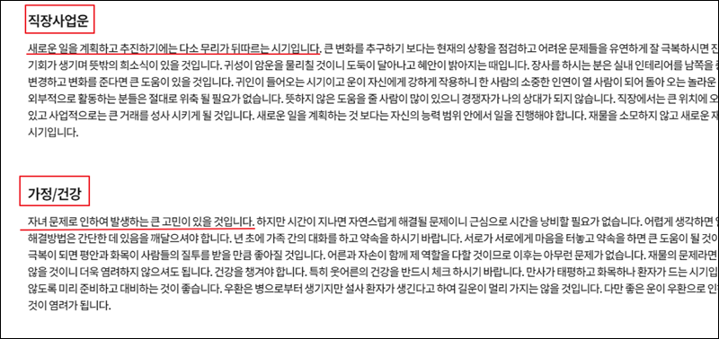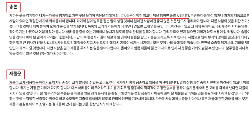 가장 먼저 만나볼 수 있는 무료 토정비결의 해석은 총론이에요. 2021년 들어오는 운에 대하여 총체적으로 알려주는 해석인데요. 좋은 이야기만 있는 것이 아니라 나쁜 소식도 전해주곤 해요. 나쁜 소식이 있을 때에는 이를 극복하는 데에 도움이 되는 이야기도 해줘요. 그렇기 때문에 걱정하실 필요는 없어요.
