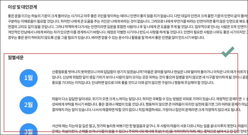 월마다 들어오는 운에 대해서도 보는법을 알려드릴게요. 월별세운에 있는 내용을 참고하시면 돼요. 매월마다 3줄 분량의 해석을 통해 간단히 나의 월 운세를 알아볼 수 있어요.