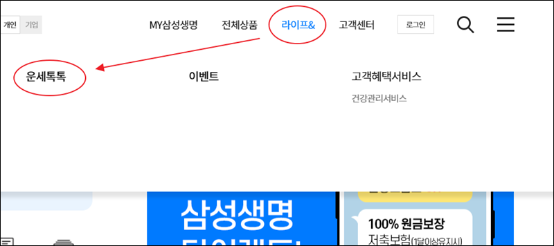 인터넷으로 이용할 수 있는 사주팔자 서비스는 꽤 많아요. 요즘에는 무료로 간단히 볼 수 있는 사이트가 많은데요. 그 중에서 삼성생명 공식 사이트를 이용해 볼게요. 이곳에서는 전통적인 방식으로 사주팔자를 보는법과 함께 타로카드와 같이 다양한 방식으로 운세 보는법을 이용할 수 있어요.