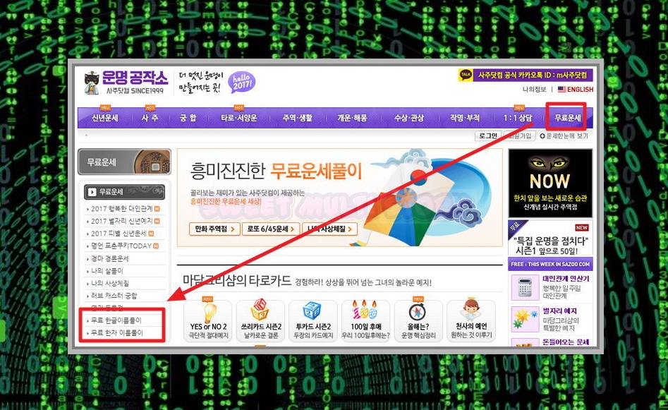 ▲ 메뉴에서 '무료운세 ▷ 무료 한자 이름풀이' 클릭