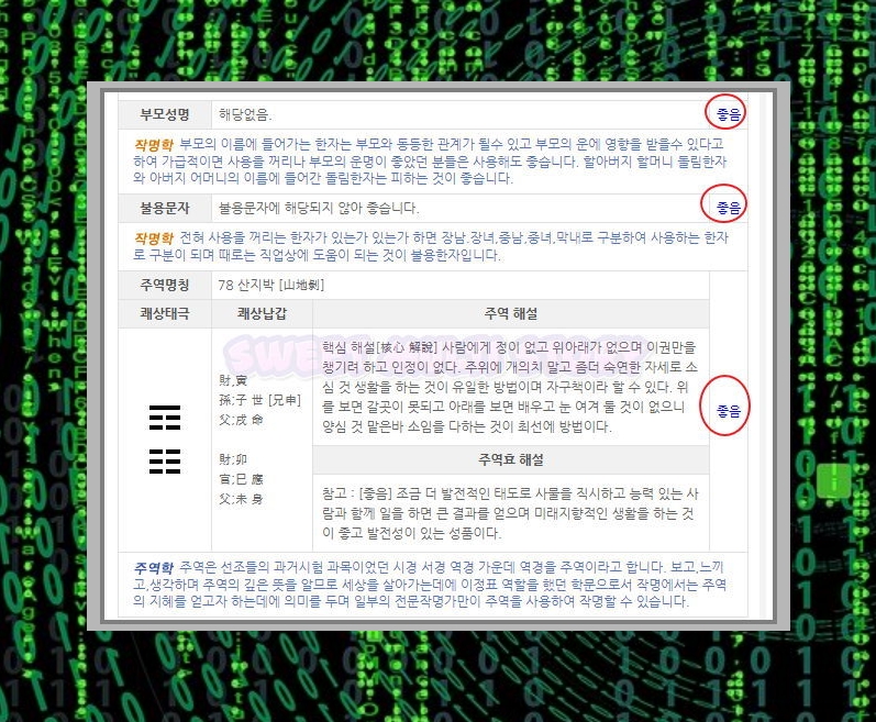 일반적으로 대부분의 이름풀이 무료사이트에는 부모와의 관계가 나오지 않습니다. 하지만 여기서는 서로 좋은 영향을 주는지 확인할 수 있는데요. 저는 좋다고 하네요.