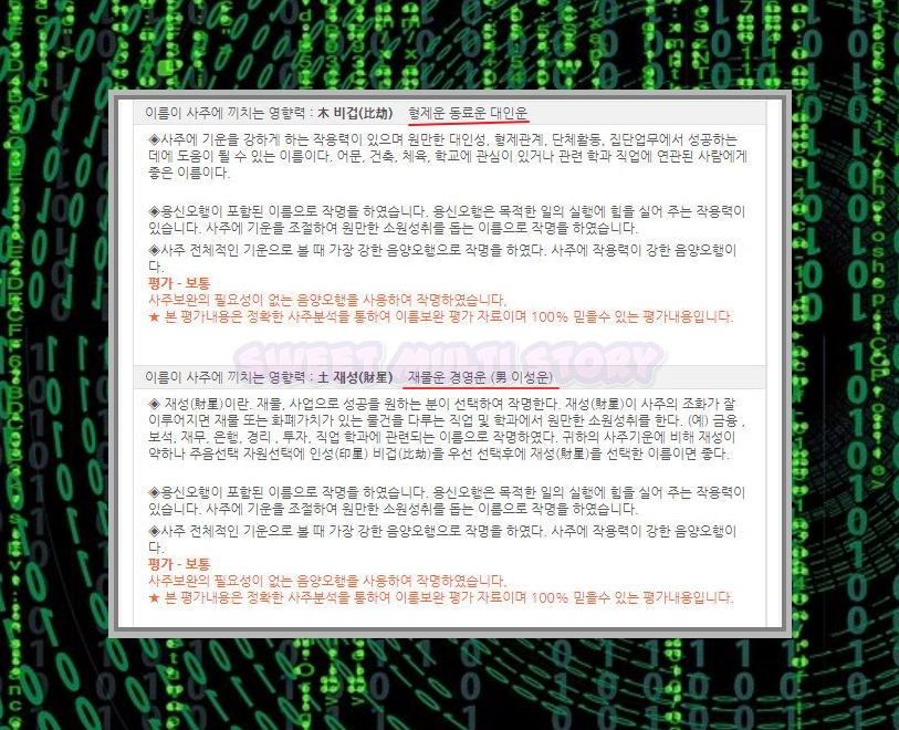 이름이 사주에 끼치는 영향력을 구체적으로 알아볼 수 있는데요. 형제운, 동료운, 대인운, 재물운, 경영운 모두 무료로 살펴볼 수 있습니다. 긴 글을 읽을 시간이 없다면 '평가 부분'만 봐주시면 됩니다. 저는 보통이네요.