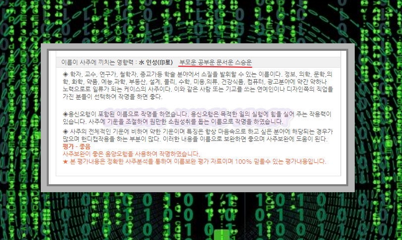대부분의 작명 관련 사이트에서는 단순히 글자에 대한 풀이만 해줍니다. 그리고 그 이상의 수준 높은 해석을 보고 싶다면 유료 서비스를 이용해야 하는데요. 여기는 좀 다릅니다. 무료 서비스임에도 퀄리티가 매우 높고, 자세해요.