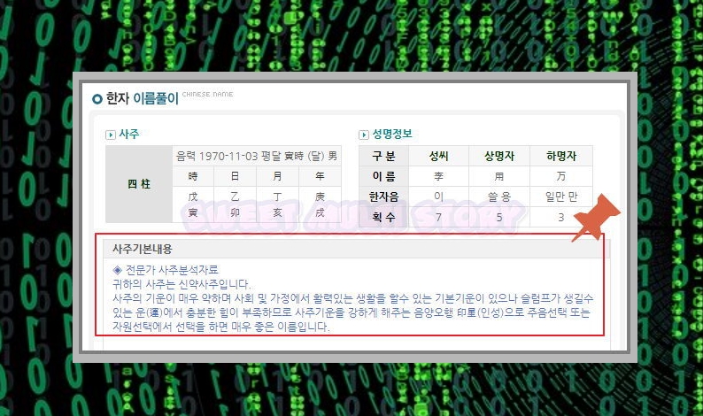 성명학에 근거하여 획수음양, 주음오행, 자원오행을 알아봅니다. 일반인은 알기 어렵죠? 그래서 오른쪽에 간단한 평가가 나와 있답니다. 풀이결과를 이해하기 어렵다면 참고해주세요.