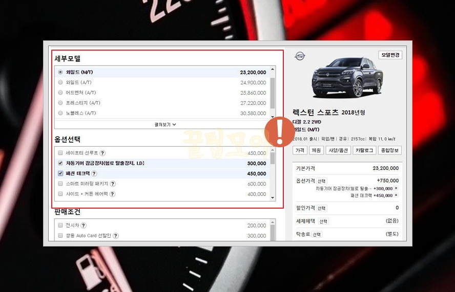 3) 신차를 구매할 때에는 가격표는 참고만 하셔야 합니다. 판매조건에 따라서 가격에 차이가 있기 때문이죠. 전시차를 구매하거나 쌍용자동차의 Auto Card 선할인을 받거나 사업자 고객인 경우에는 추가 할인을 받을 수 있습니다.
