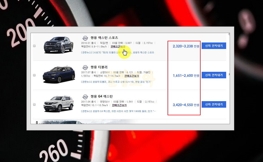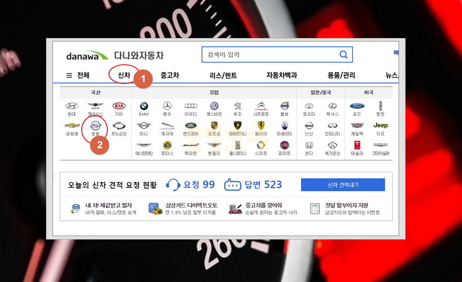 5) 메뉴에서 신차를 클릭한 후 국산 브랜드인 쌍용을 클릭해 주세요. 쌍용자동차 외에도 현대나 기아, 유럽이나 일본, 미국 브랜드의 자동차에 대한 신차가격표 또는 상세한 정보를 얻을 수 있습니다.