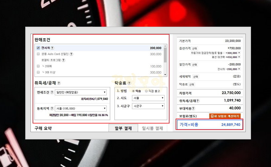 7) 현재 쌍용자동차의 신차를 구매할 때 이용할 수 있는 판매조건을 선택해 주세요. 이와 함께 취득세, 공채, 탁송료에 대한 정보를 입력하면 오른쪽에 있는 가격표에서 정확한 금액을 확인하실 수 있습니다.