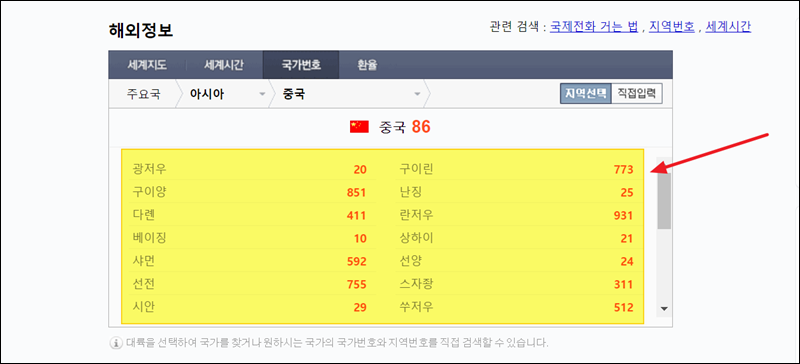 2. "중국"을 클릭하면 해당 국가에 있는 모든 지역에 할당이 된 숫자가 나타나요. 이러한 숫자까지 정확하게 알아야 국제전화 거는법을 제대로 진행할 수 있어요. 새롭게 열린 페이지를 보면 광저우는 20번, 구이양은 851번, 다렌은 411번, 시안은 29번 등으로 되어 있어요.