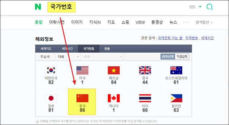 1. 해외통화 하는 방법에 앞서 필수적으로 확인해야 할 사항이 있어요. 바로 국가번호인데요. 중국의 경우에는 86번을 사용하고 있어요. 우리나라는 82번, 미국은 1번, 베트남은 84번을 이용하고 있죠. 네이버에서 "국가번호"를 검색하면 쉽게 확인이 가능한데요. 여기에서 "중국"을 클릭해 보세요.