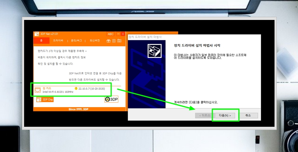 7. 3dp net을 사용하여 노트북 무선랜카드 드라이버를 설치하는 방법은 간단해요. 해당 프로그램이 실행되면 프로그램 하단에 랜카드 이름이 나타나는데요. 해당 이름을 더블 클릭합니다. 그럼 "장치 드라이버 설치 마법사"가 시작이 되는데요. 안내에 따라 "다음"버튼을 누르면 돼요.