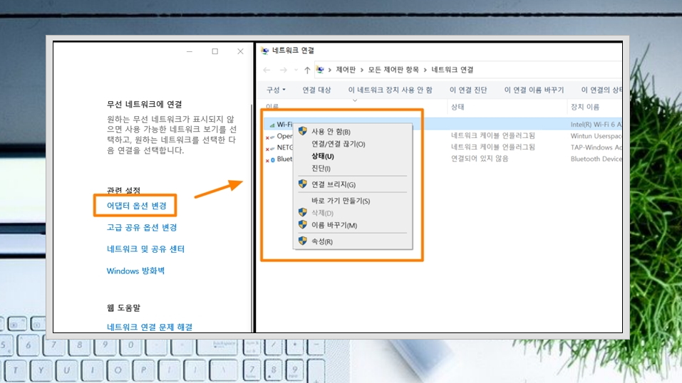 4. 공유기 연결을 했음에도 무선인터넷이 제대로 작동하지 않거나 공유기 리스트 화면 조차 나오지 않을 수 있는데요. 이럴 때에는 관련 설정에 있는 "어댑터 옵션 변경"을 클릭해 보세요. 노트북에서 사용할 수 있는 네트워크 리스트가 나타나는데요. "Wi-Fi"에 우클릭을 한 후 "사용"과 "연결"을 눌러 사용 그리고 연결 상태를 유지하도록 해주세요.