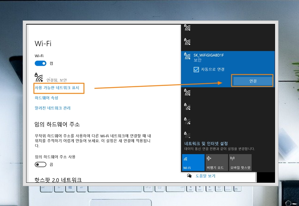 3. 와이파이를 "켬"으로 변경했음에도 불구하고, 노트북에서 무선인터넷이 작동하지 않을 때에는 다음 방법을 사용해 보세요. 일단 "사용 가능한 네트워크 표시"를 클릭해 보세요. 그럼 작업표시줄 근처에 여러 가지 공유기 리스트가 나타나요. 여기에서 본인이 사용하는 공유기에 있는 "연결" 버튼을 눌러 주세요.