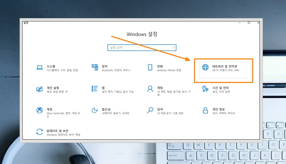 1. 노트북을 켠 후 "시작" 버튼을 눌러 "설정"으로 들어가 주세요. 그럼 Windows 설정 창이 열리는데요. 여기에서 "네트워크 및 인터넷"을 선택합니다.